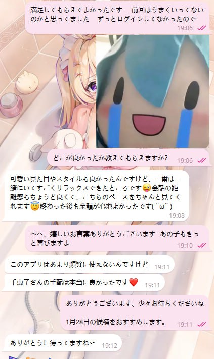 お客様の声:可愛い見た目やスタイルも良かったんですけど、一番は一緒にいてすごくリラックスできたところです😜会話の距離感もちょうど良くて、こちらのペースをちゃんと見てくれます😇終わった後も余韻が心地よかったです( ˘ω˘ )